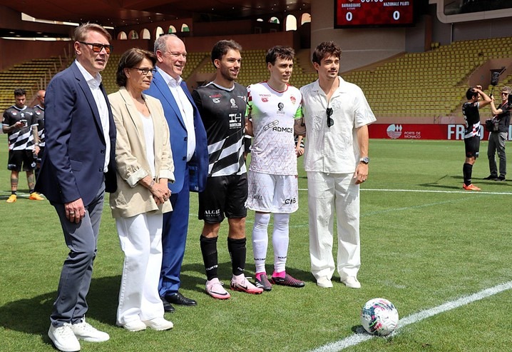 Pronti per il calcio d’inizio: da sinistra Mika Hakkinen, la Principessa Stéphanie, il Principe Alberto, i due capitani e Charles Leclerc
